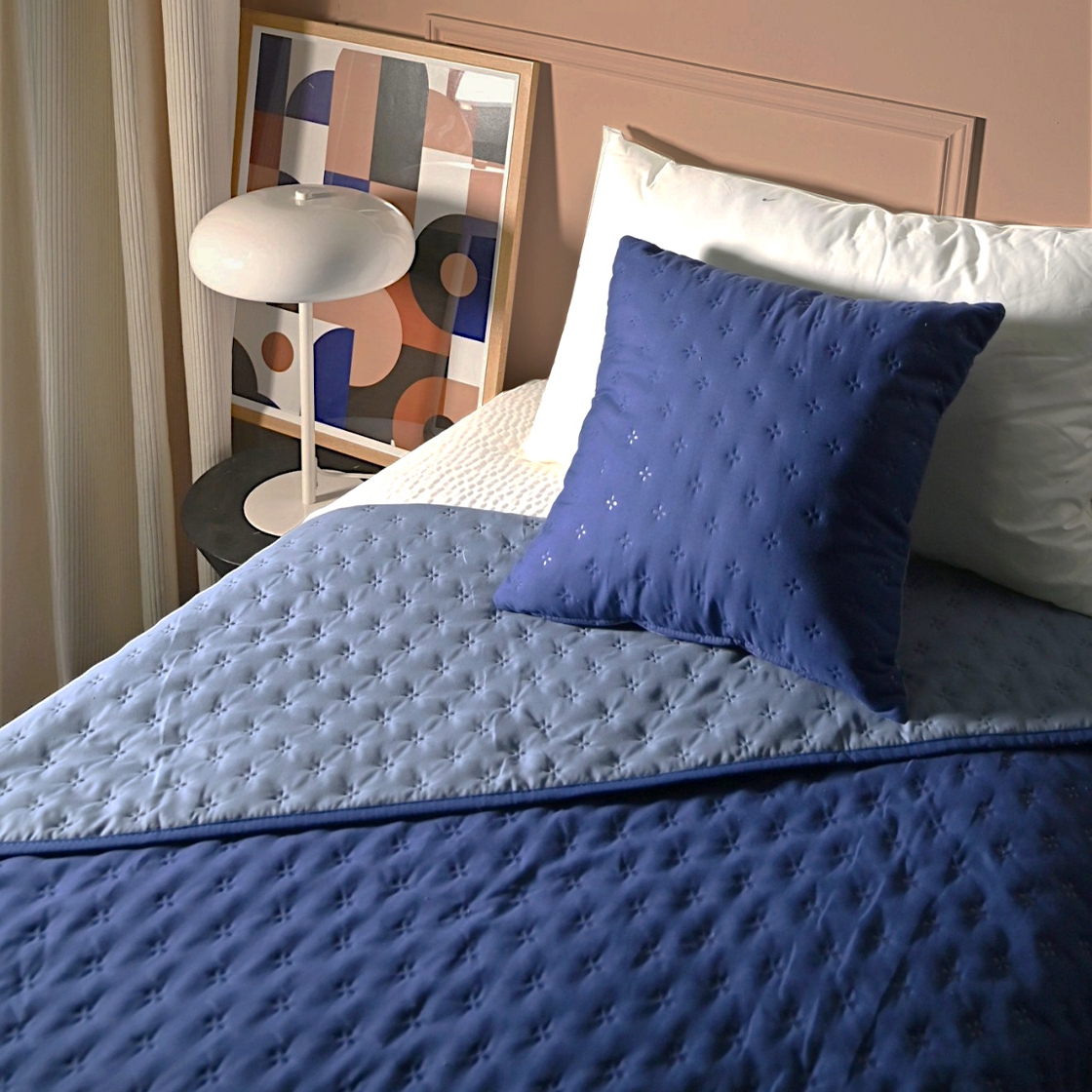 Le couvre-lit Jill est un plaid matelassé double face qui présente l'endroit d'un coloris et l'envers d'un autre coloris. Très doux, ses bords son cousus avec un biais et ses quatre coins sont arrondis.