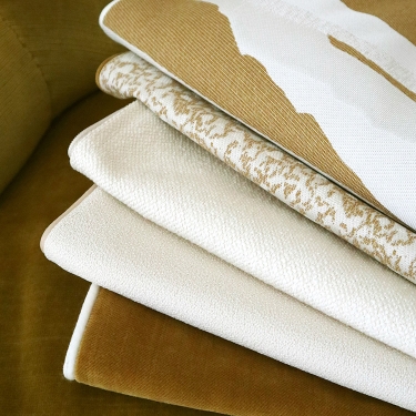 Deux velours de grande qualité viennent enrichir cette nouvelle collection et s’accordent parfaitement avec les différents jacquards qui la composent. Moon avec son aspect légèrement patiné apporte beaucoup de lumière et de raffinement aux espaces qu’il habille. Le modèle Sensuous quant à lui, est un velours écoresponsable composé majoritairement de polyester recyclé. Il est décliné dans des couleurs riches et profondes qui reflètent délicatement la lumière. Polyvalents, ces deux modèles peuvent être utilisés pour de nombreuses applications en ameublement et rideaux.