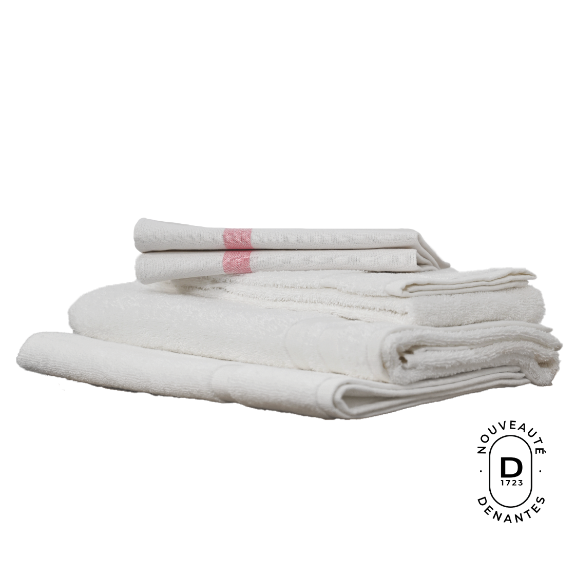 Il est composé d'un drap de bain 70x140cm, d'une serviette 50x100cm, d'un tapis de bain 50x75cm dans la gamme Be-Eco ainsi que de deux torchons Liteau rose en 100% coton pour la cuisine.
